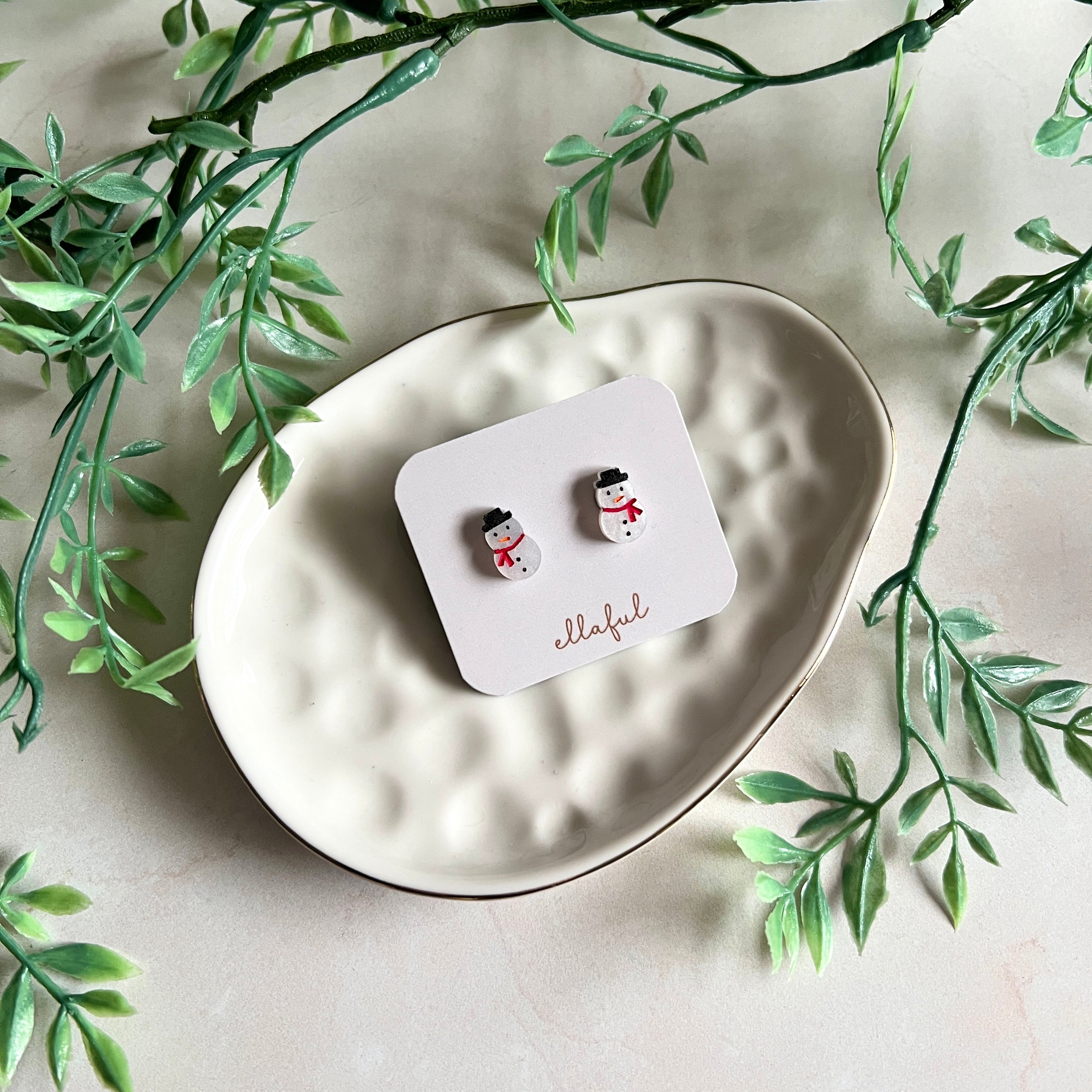 Cute snowman stud earrings to add to your winter outfits. The snowman design is hand drawn and each snowman is hand painted to highlight the details of the snowman.