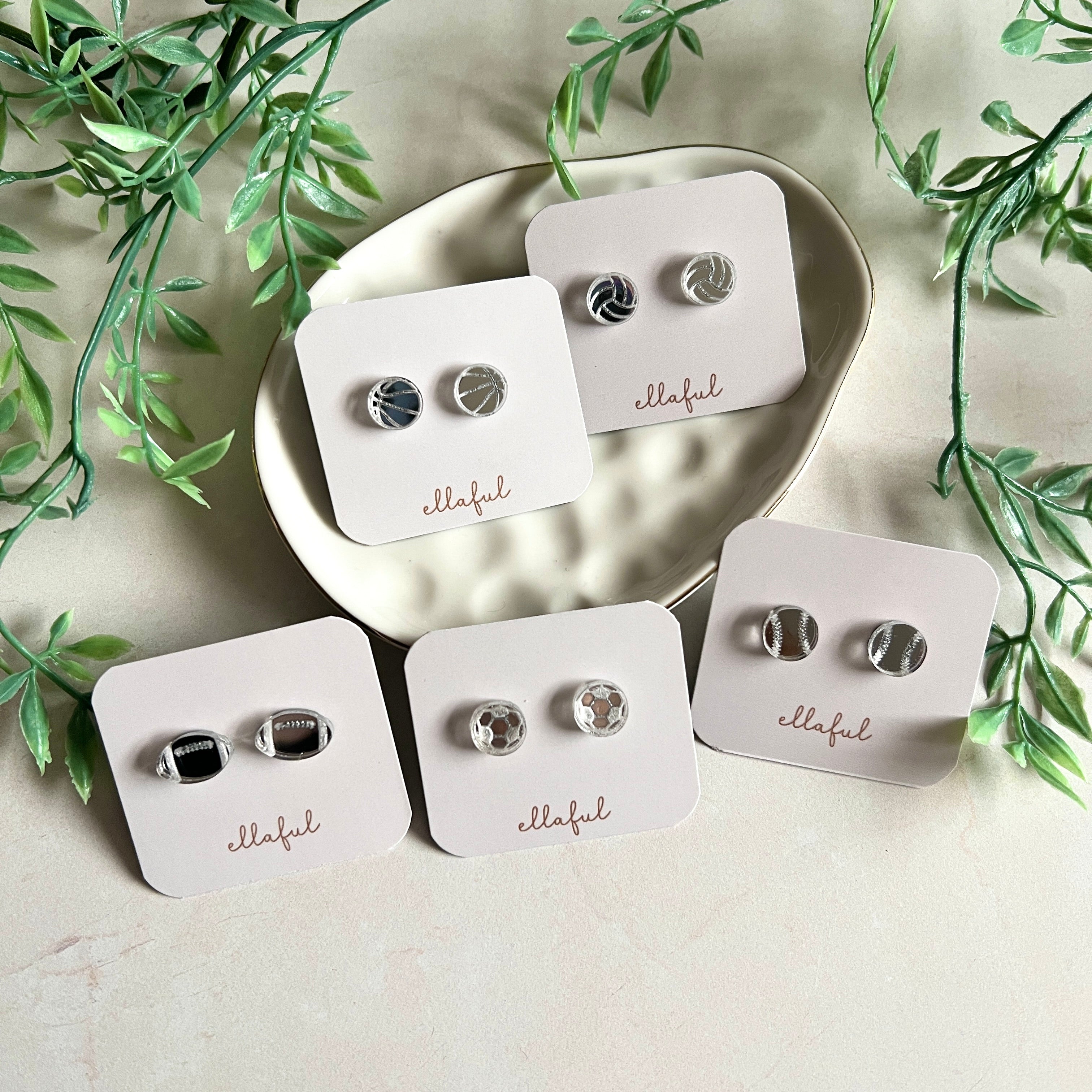 Sports stud earrings that are cute to wear for games and events. The sports are engraved and cut on mirror finished acrylic.